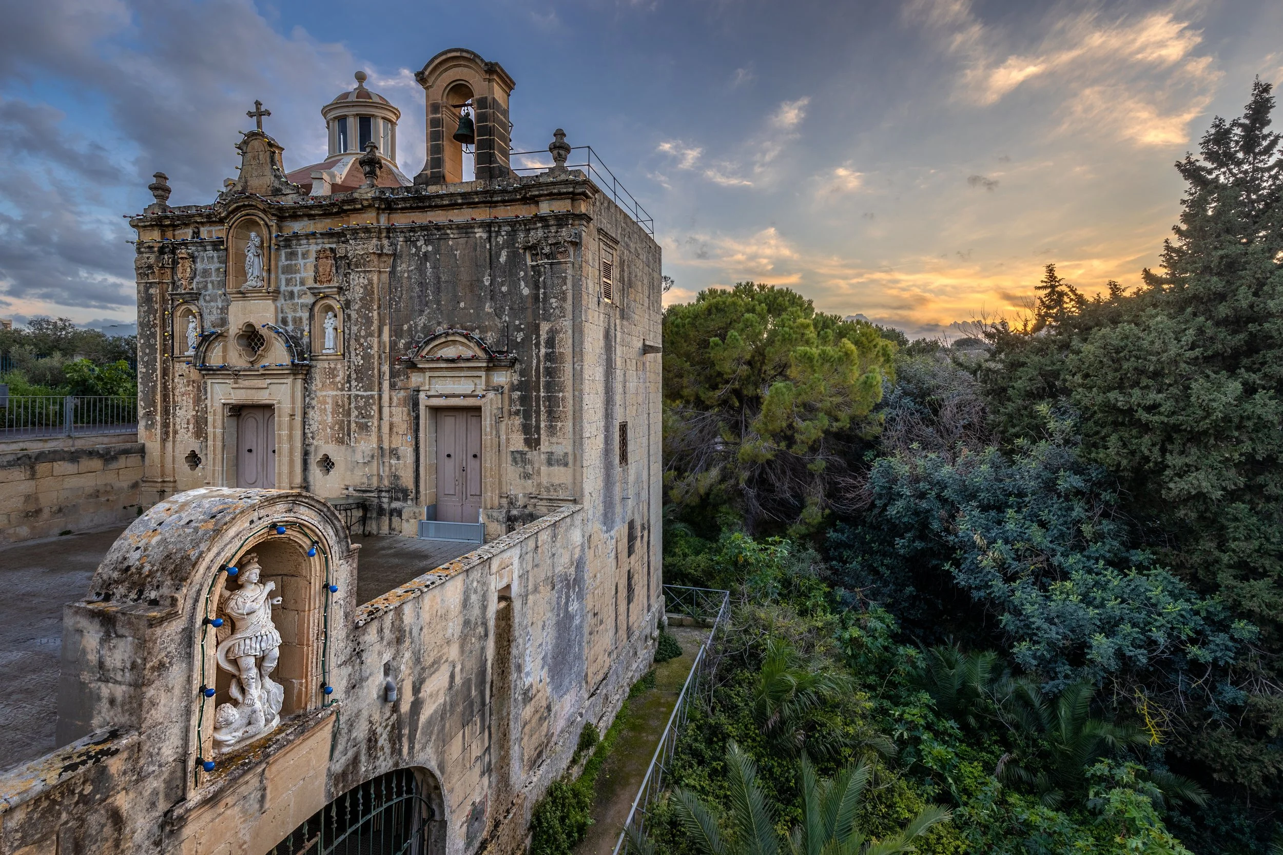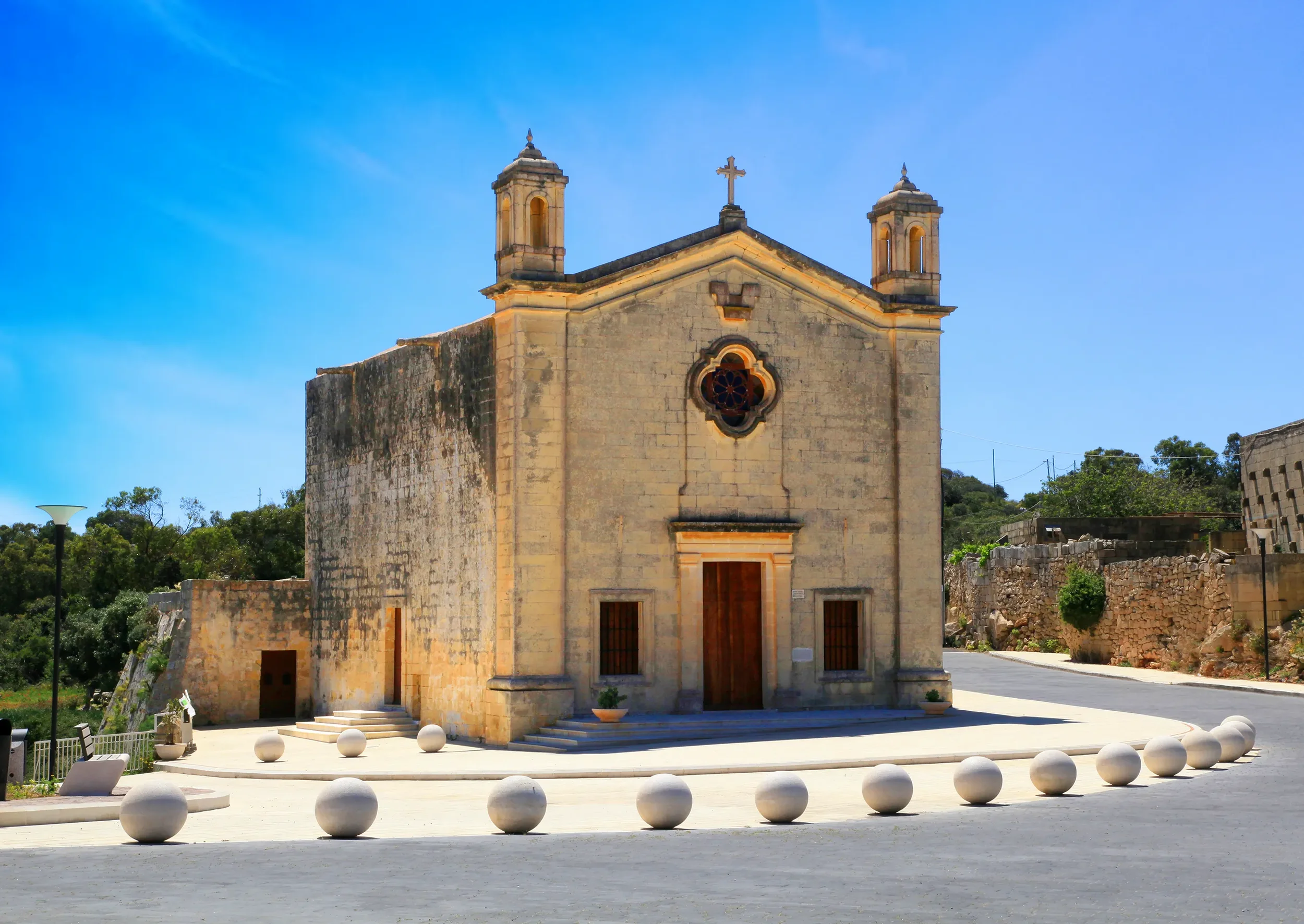 One of the smallest chapels we suggest, holding around 30 people inside. The chapel sits above a small cave on the edge of the valley. The parvis feels almost like a bridge overlooking the landscape. Because of its size, it fills up quickly and feels beautifully intimate. Be mindful of feast days or local markets when planning, as parking can become difficult. For smaller weddings, hire a minivan service or even an old Maltese bus to bring the whole party to the chapel.