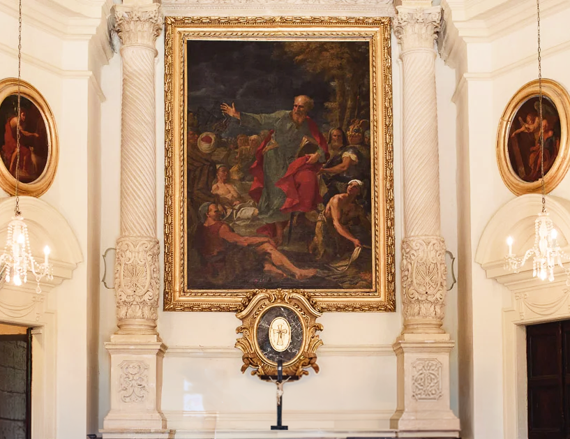 The main altar, framed by carved stone columns, houses the titular painting of the Shipwreck. Saint Paul is shown holding the serpent while addressing the Maltese gathered around him — a powerful visual reference to the biblical account.
